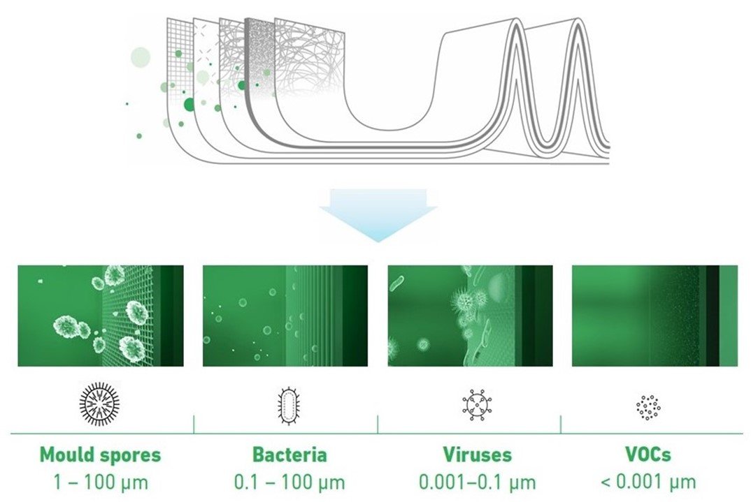 + Màng lọc HEPA H14 có hiệu suất cao - chuẩn y tế cao nhất đến từ Đức, làm sạch 99.995% các vật thể có kích thước nhỏ tới 0.01 micromet, nấm mốc, vi khuẩn, virus và VOCs. Không có cơ hội sống sót cho vi sinh vật trong màng lọc HEPA vì cấu tạo của các sợi polypropylen.
